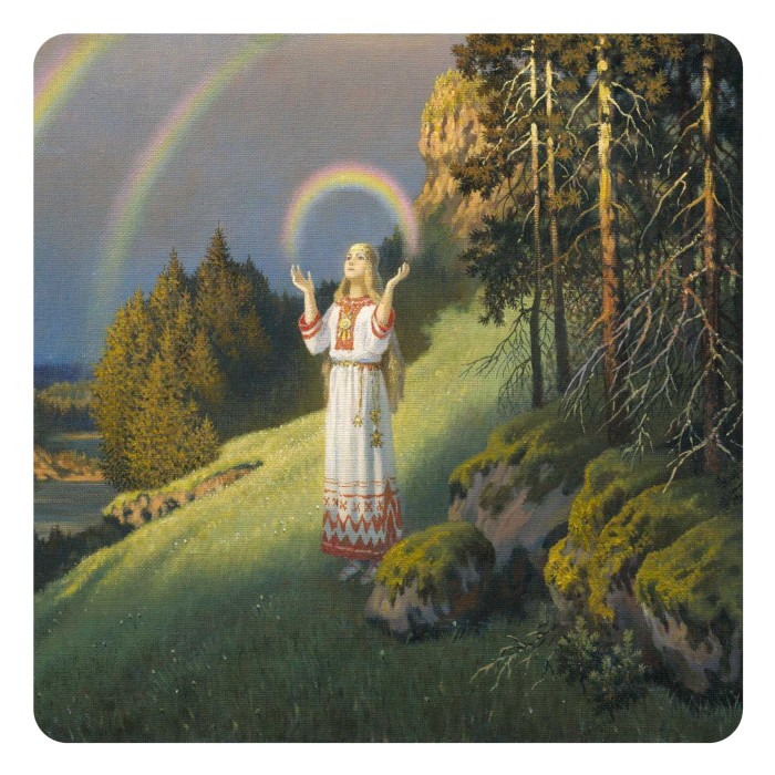 По обе стороны от Лели ставили угощения и приношения: хлебный каравай, расписные яйца, творог, сметану и другие праздничные продукты. Молодые девушки собирали полевые цветы и плели венки, которые тоже дарили Леле на счастье.